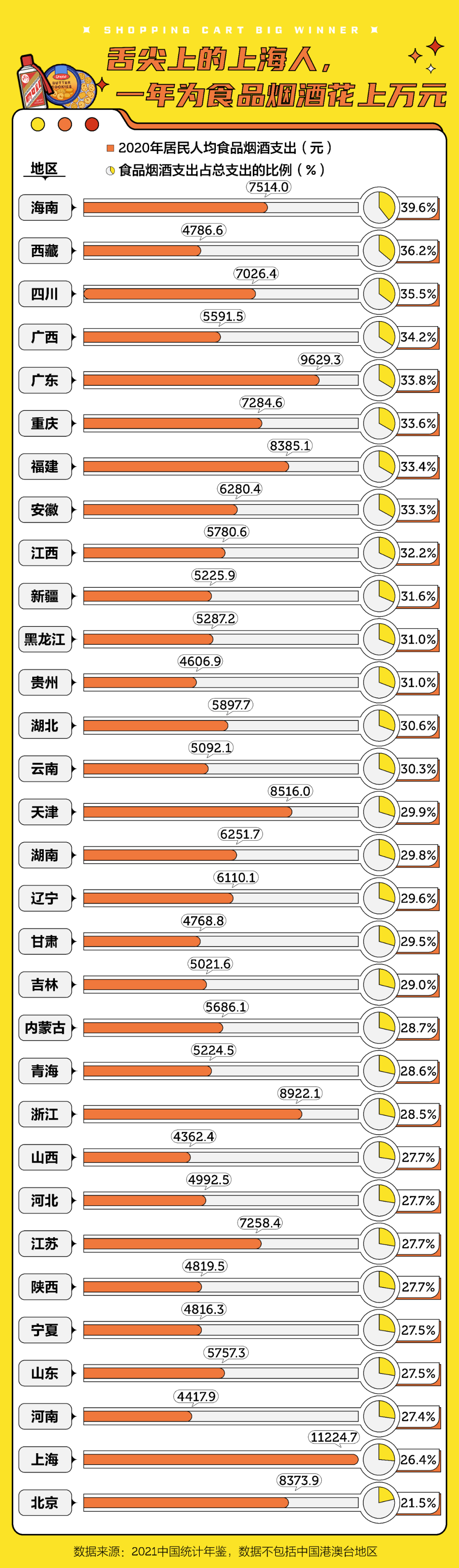 在“爱吃”这件事上,南方甩了北方三条街。食品烟酒支出前十的省市中,北方只有北京和天津上榜,而上海再次荣登榜首。山西、河南在这一项上的支出则最低 [1]。