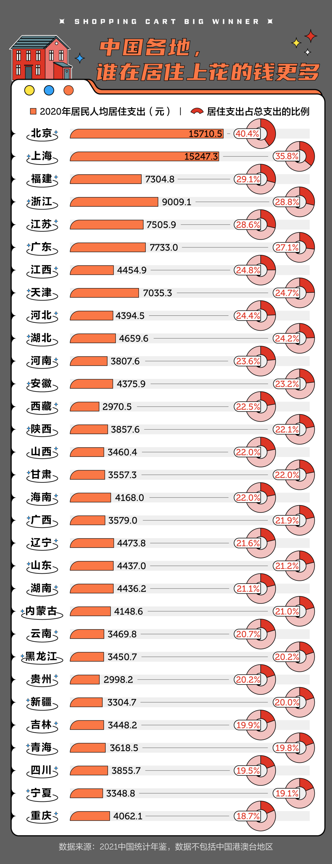 虽然在全国层面,居住支出的占比输给了食品烟酒,可一旦分省看,部分省份的居住费用比食品烟酒支出要高 [1]。
