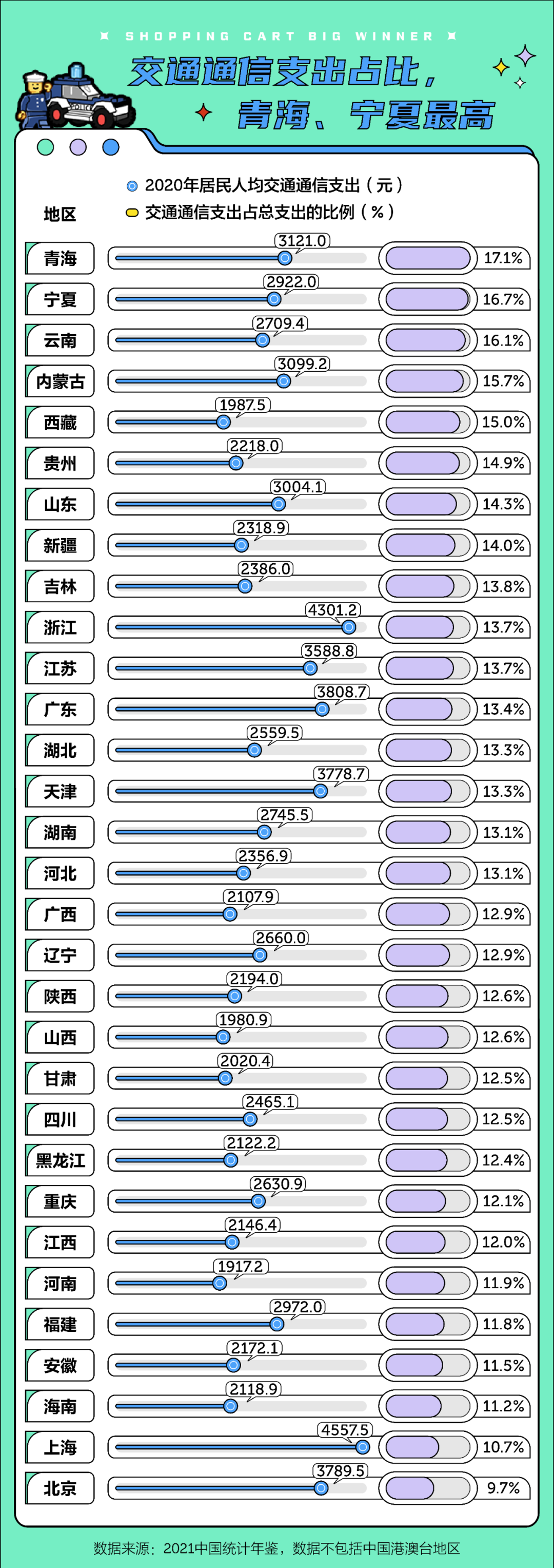 从占比来看,青海、宁夏、内蒙古、新疆等西部内陆省份人均交通通信支出占总支出比例较高,一大原因是这些地区地广人稀 [6]。