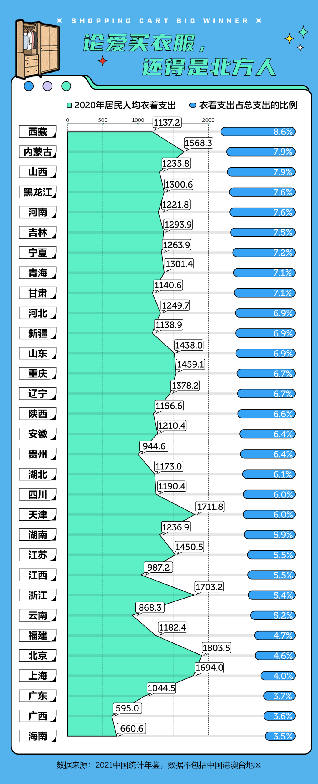 总体而言,整个北方在买衣服上的热情都不低,纷纷争做时尚“弄潮儿”。服饰支出占比位于前 15 的省份中,只有两个不在北方,广东、广西等南部省份则纷纷垫底 [1]。
