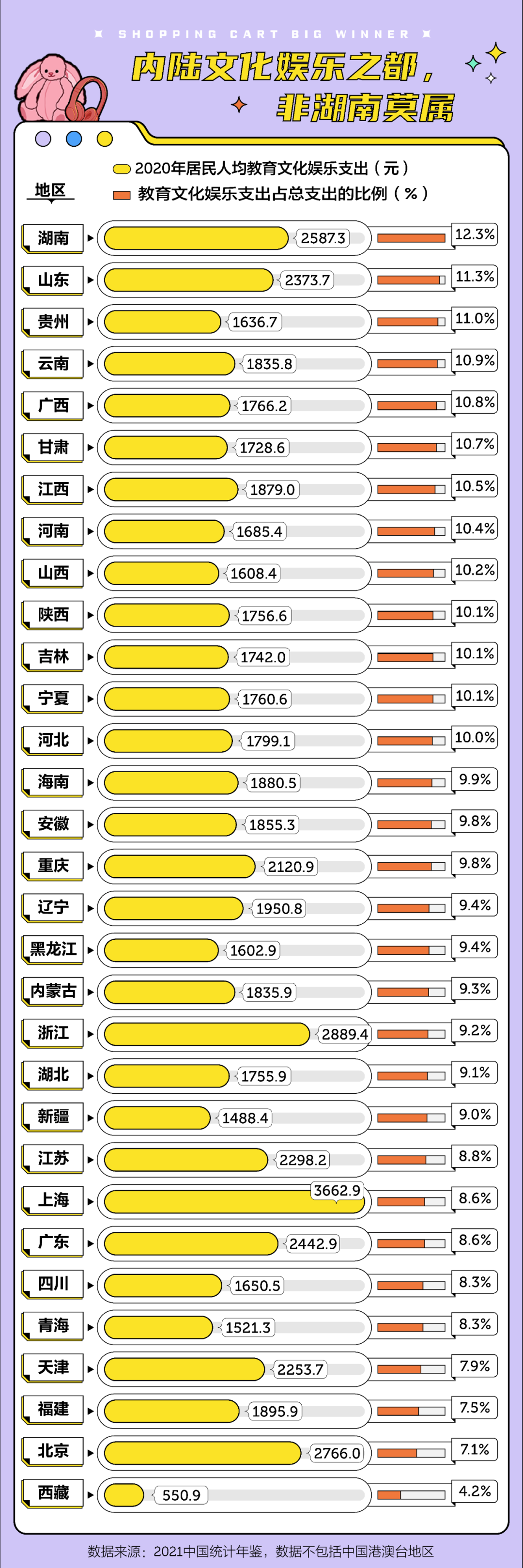 在丰富的文化娱乐资源加持下,东部地区居民的人均教育文化娱乐支出相对更高,在前 10 中独占 7 席 [3]。