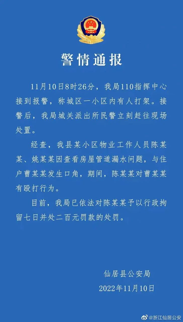 11月10日晚23时许,仙居县公安局对此事发布通报,涉事物业工作人员陈某某被警方予以行政拘留七日并处二百元罚款的处罚。