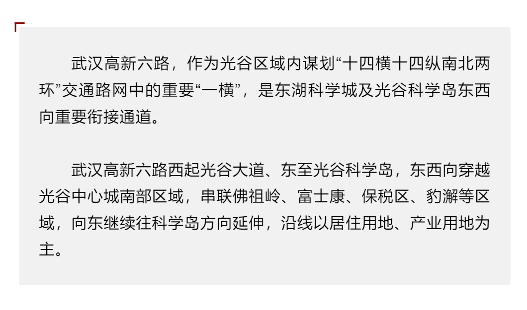 武汉高新六路(光谷大道—光谷三路)改造路段,西起光谷大道、东至光谷三路,全长约5.6公里。