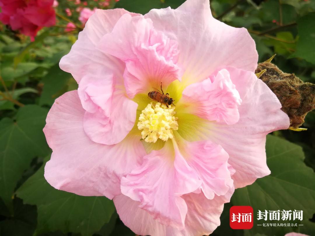 本次文化旅游节以芙蓉花为媒,在做好常态化疫情防控的基础上,打好“线上+线下”组合拳,开展以“花开金堂 醉美芙蓉”云赏花、“相会水城 缘定金堂”诗歌朗诵、“乐游花海”汉服游园会、特色农产品及“蜀葵芙蓉桑蚕”文创产品展销会、“芙蓉花开迎盛世”为主题的文化分享会等6项特色活动。封面新闻记者在现场看到,芙蓉花以娇嫩粉色,为初冬带来亮色,不少汉服妆扮的游客,乐于花间嬉戏留影。