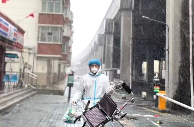 11月10日,伴着雨雪,郭昊晨为居民送药和轮椅。艾力夏提·赛买提摄