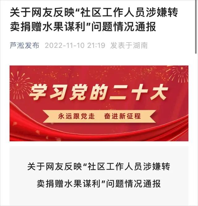 11月9日,有网友反映“芦淞区建设街道操坪社区工作人员转卖爱心商家捐赠水果谋利”,引发网络关注。株洲市委、芦淞区委高度重视,迅速成立核查组进行核查。