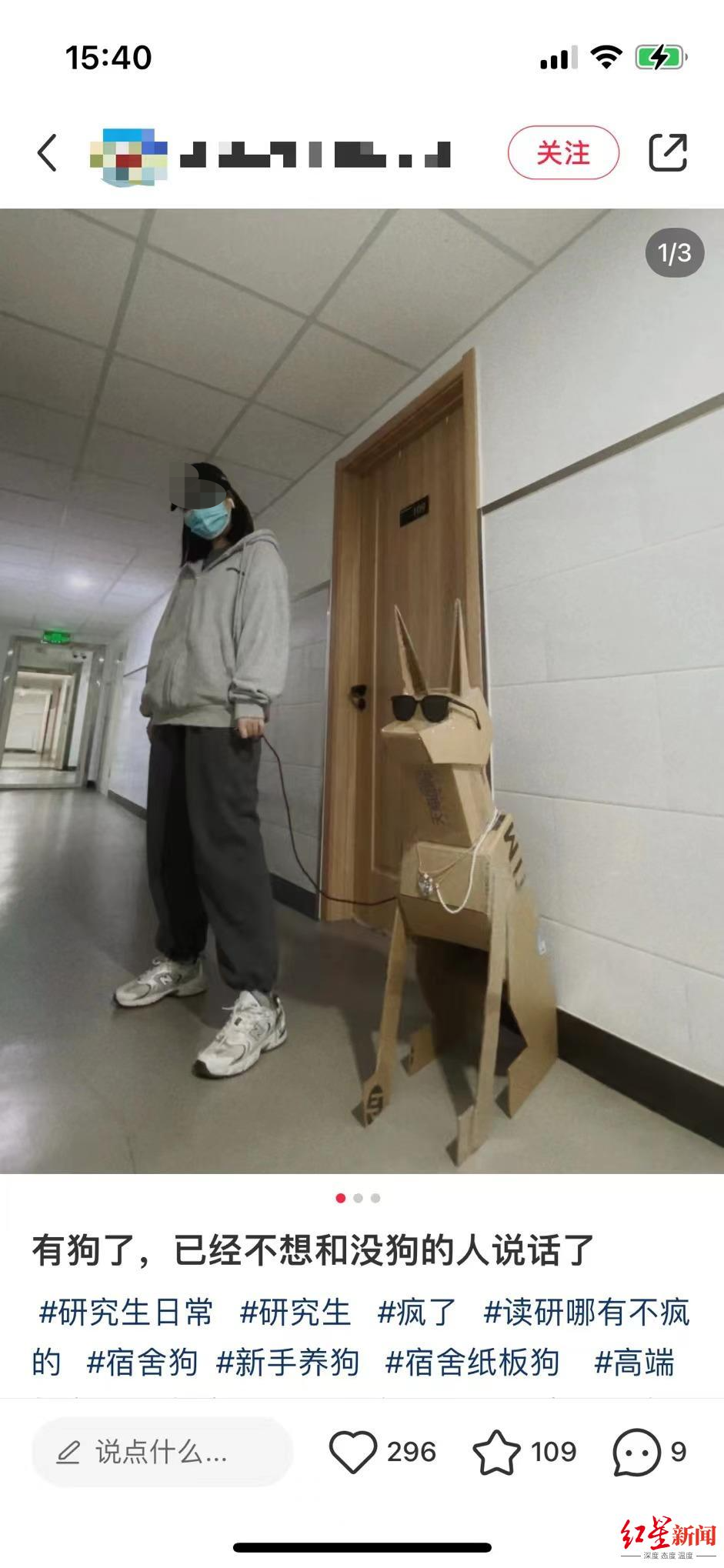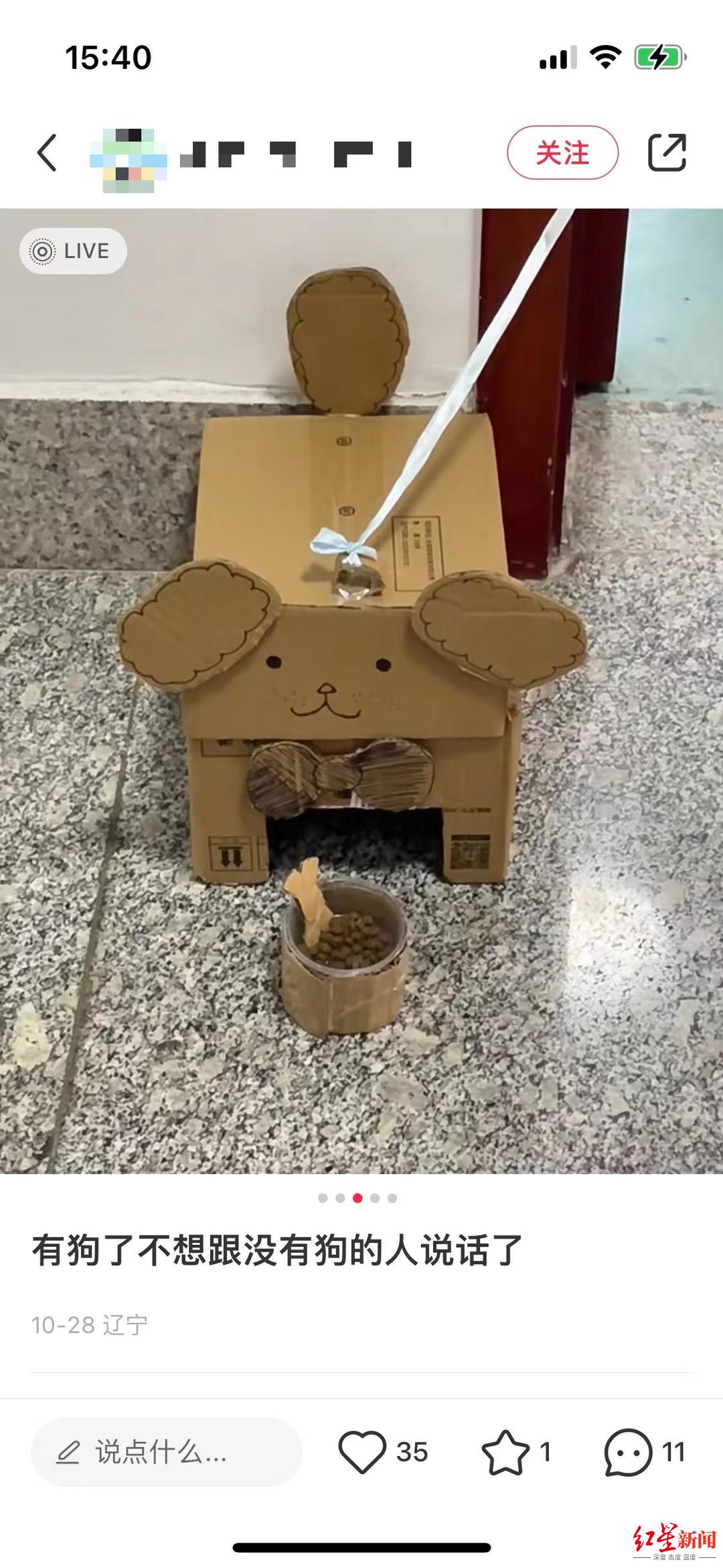 四川电影电视学院20级广播电视编导专业的学生陈会就有一只“纸盒狗”,“出生”于10月31日。陈会说,自己喜欢做手工,从网上看到很多其他学校的同学都有了属于自己的“小狗”,她也突发奇想,不如做一只“纸盒狗”陪自己,还可以“牵着”去操场“遛”。