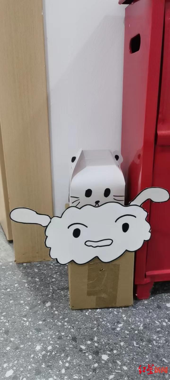 “我们学校很多人都在‘养纸盒狗’,正好我也有废纸箱,就跟着做了一个。”成都大学2019级音乐表演专业的学生周月冰说,不止“纸盒狗”,她还多做了一个小伙伴——“纸盒猫”,找了一张白纸,画了图案,剪下来直接贴在纸盒上,只花了几分钟。“感觉挺搞笑的,大家都有“纸盒狗”放门口,就当快乐一下。”