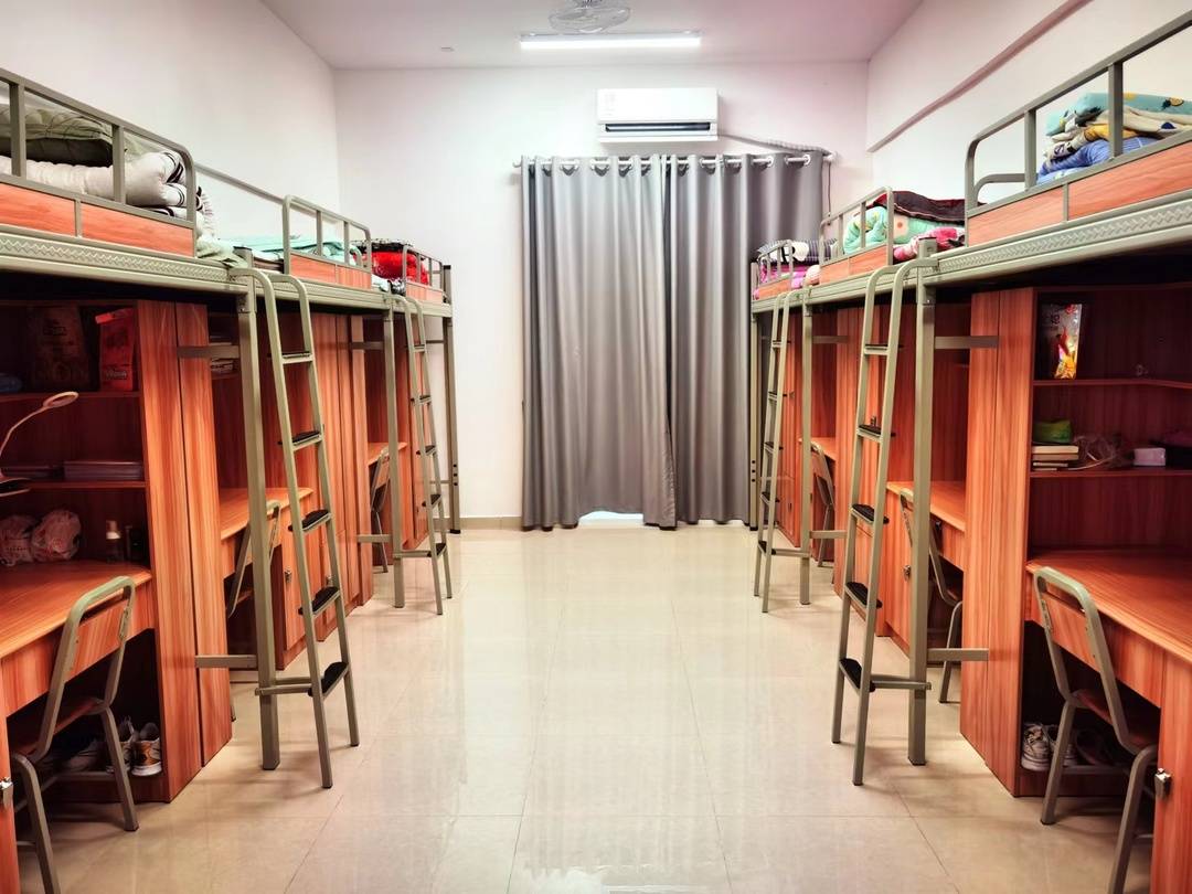 走进女生宿舍枕月轩,宿舍阿姨笑脸盈盈地为记者开门,颇为自豪地说:“我们这个宿舍环境很好,和大学一样。”这里一共有5层楼,有电梯、活动室等。寝室为6人间,下方书桌上方床铺,配备有衣柜、空调、热水器,两个盥洗台和独立卫生间。