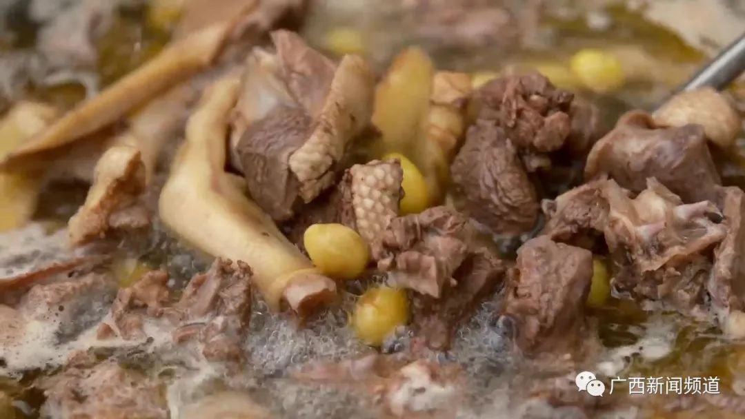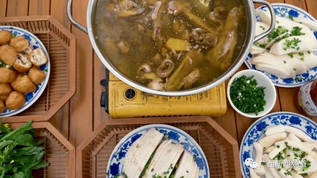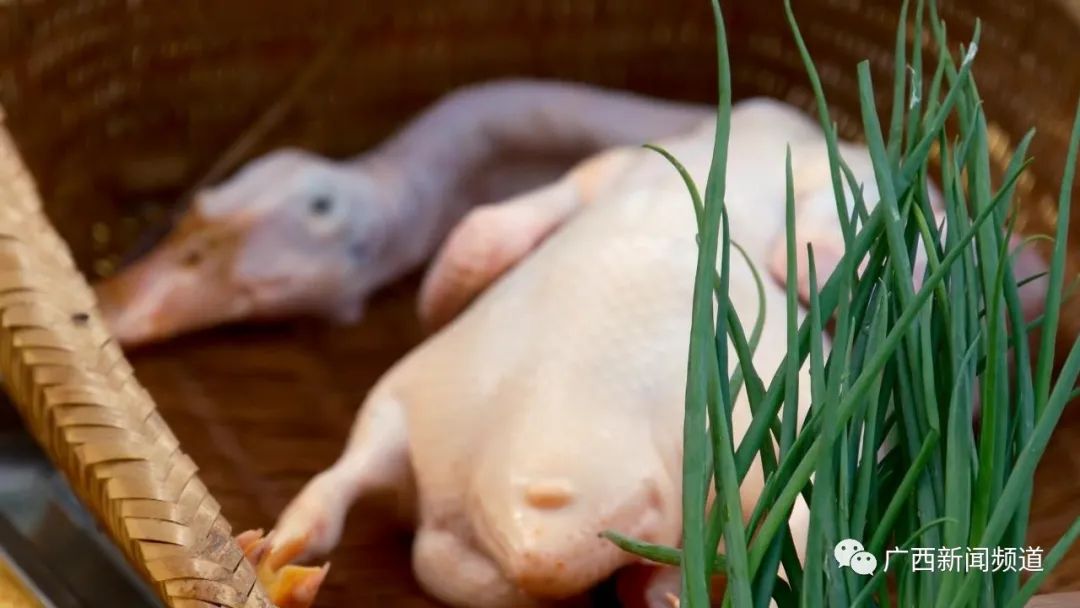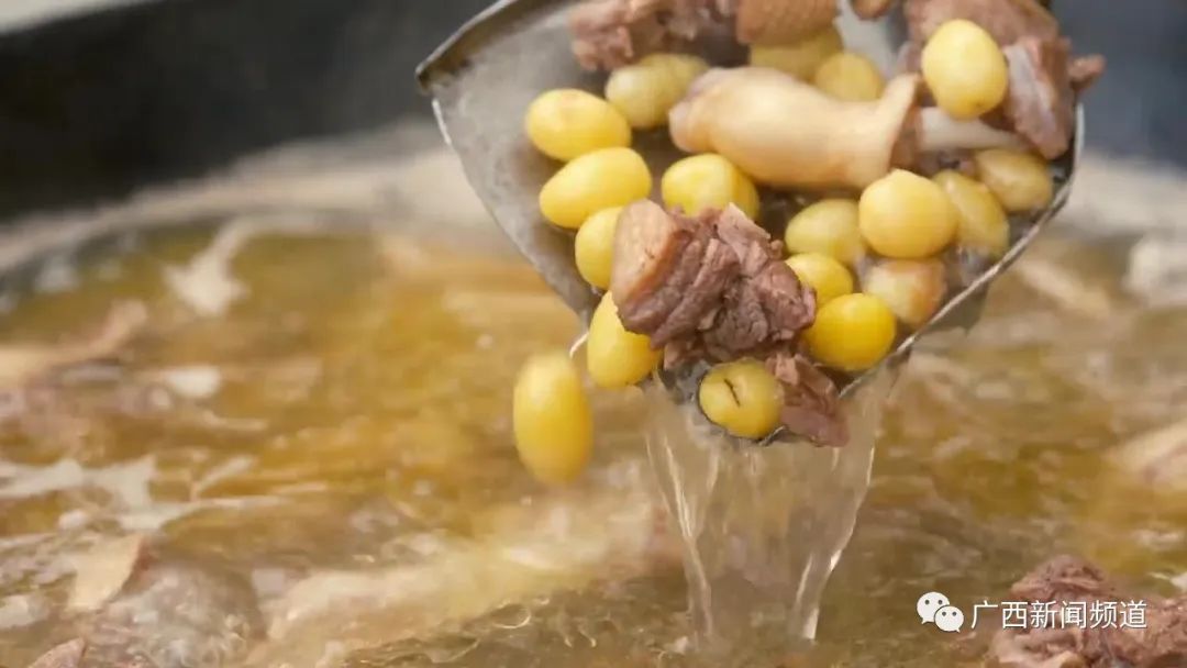 灵川县大桐木湾村村民 唐广毅:用这个老银杏树的白果煲这个鸭汤,不用放什么佐料都清甜爽口,鸭肉鲜甜,现在就倒进去了,小火慢炖,炖半个小时就可以出锅可以上桌了。