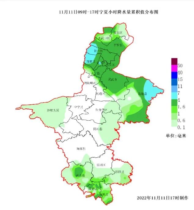 今天白天银川、石嘴山、固原三市,吴忠市盐池县、红寺堡区东部、同心县东部,中卫市沙坡头区、海原县南部出现小雨或雨夹雪,最大累计降水量出现在吴忠市盐池县气象站为5.1毫米(08时至17时),最大小时雨强出现在固原市隆德县杨河乡为2.1毫米(11时),银川站4毫米;石嘴山、吴忠、中卫和固原四市全市出现4~5级偏北风,部分地区阵风8级左右,最大阵风出现在石嘴山市惠农区长城加油站为22.8米/秒(11时)。