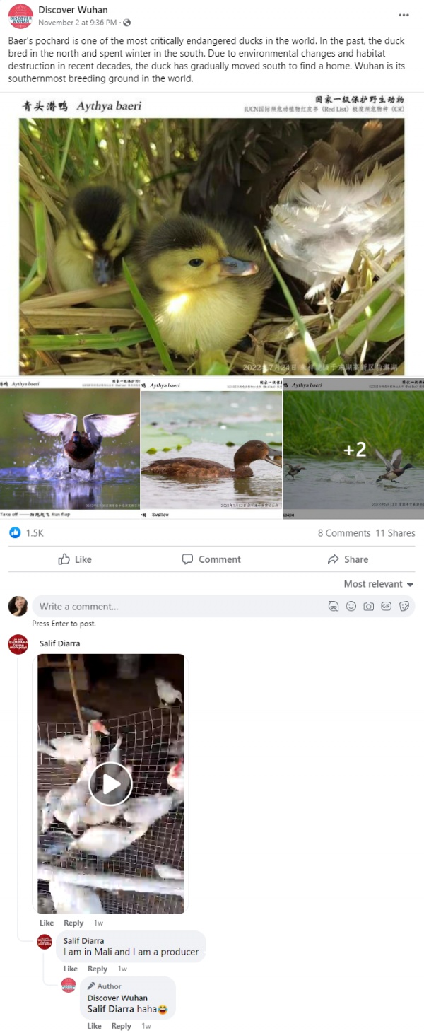 “我在马里也养了很多鸭!”11月2日,一位来自马里共和国的网友在“发现武汉”海外账号上热情留言,并大方晒出了自己养的家禽。原来,贴文里头大肚圆的青头潜鸭助跑起飞、吞食、逃跑时的各种萌态,吸引了这位来自西非的饲养员。但他不了解的是,青头潜鸭并非家禽,其珍稀程度堪称“鸟中大熊猫”。目前,青头潜鸭在全球仅存一千余只,属极度濒危物种,也是我国一级保护野生动物,而武汉因其丰富的湿地资源,已经成为这一珍稀物种在全球最南端的繁殖地。2014年,一名爱鸟人士首次在武汉府河湿地观察记录到青头潜鸭的踪影。在武汉召开《湿地公约》第十四届缔约方大会期间,青头潜鸭首次登上“发现武汉”海外账号,成为武汉城市新“代言人”。