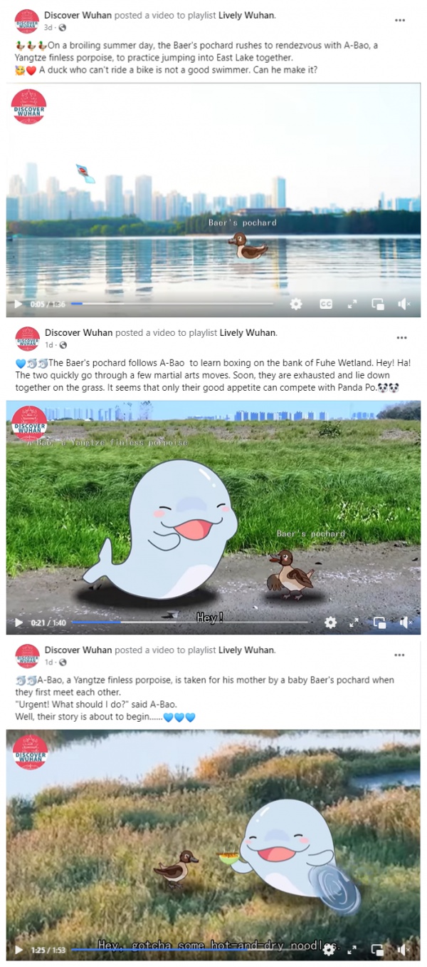 除了推出众多有关青头潜鸭的科普外,湿地大会期间,“发现武汉”海外账号发布了由武汉国际传播工作室出品的三部动画短片《跳东湖》《致敬功夫熊猫》和《湿地偶遇》。三部短片中,长江江豚“阿宝”,携手最新城市代言人青头潜鸭,分别前往东湖、沉湖湿地和府河湿地,海外观众跟着两位主人公重温盛夏时节武汉人跳东湖的热情,欣赏轻风吹绿草的府河湿地,也在静谧的沉湖看阿宝和青头潜鸭伴着落日余晖,快乐地享用着热干面。三部动画短片在海外账号上获得不俗反响,截至11月11日,总曝光量达68.4万。