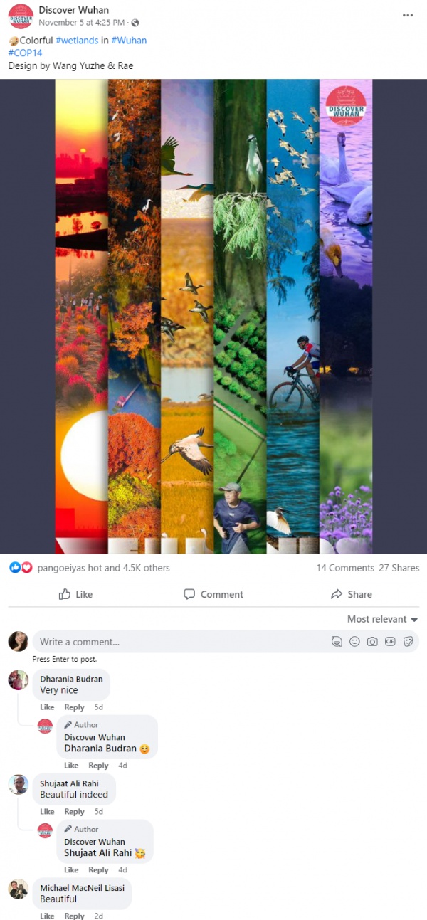 “确实很美!”“太棒了!”“美!”金银湖国家城市湿地公园、马鞍山森林公园的地肤草花海、东湖国家湿地公园的梧桐树、天兴洲的黑鹳、涨渡湖湿地跑步的市民……这张拼接海报集合武汉超过十处湿地,以高饱和度的色彩和别出心裁的拼接,将武汉这座与水相伴的城市的青山绿水、秀美无垠展现在网友眼前,这张精美海报在湿地大会召开期间受到海外网友格外关注。众多网友夸赞武汉的湿地之美,留言区被“美”字刷爆,总曝光量达13.5万。