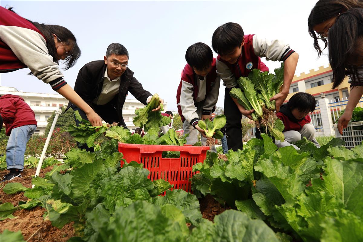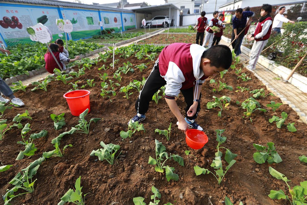 去年4月,宝丰镇黄栗九年一贯制学校建成近900平方米的校园小农场,作为学校劳动教育实践基地。目前,校园小农场里种植了茶叶、芍药、金银花以及白菜、萝卜、油菜等农作物。通过引导学生参与耕地、播种、除草、浇水、施肥、收获全过程,定期开展劳动知识培训、技能竞赛、成果展示,使学生的劳动意识、劳动兴趣、劳动习惯和劳动精神有了明显改观。(视界网 朱本双 王营中 摄)