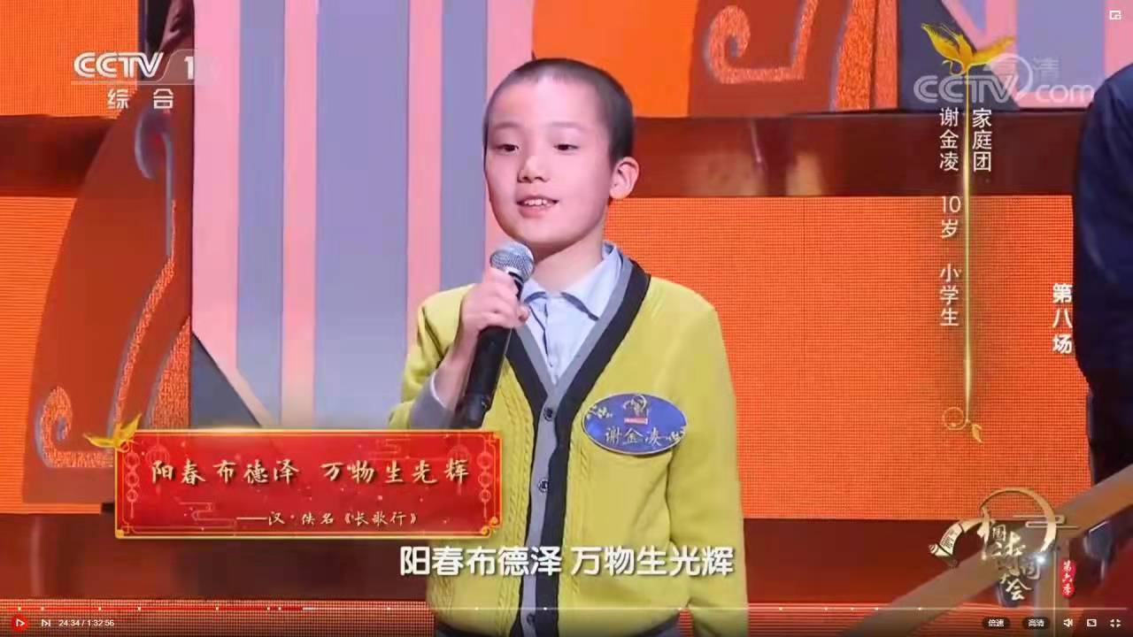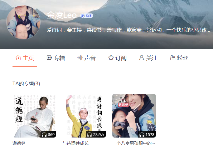 “各位亲爱的听众朋友们大家好,今天我们来讲讲马致远的《天净沙·秋思》……”打开喜马拉雅APP,找到谢金凌的账号,这个《与诗词共成长》的音频栏目就印入眼前,这篇《天净沙·秋思》的赏析便是其中第19期。点进去,少年特有的清脆嗓音传来,字正腔圆,虽然背景音有些嘈杂,音频节奏还不流畅,但并不妨碍节目一气呵成。截至目前,365期音频已累计播放23.9万余次。