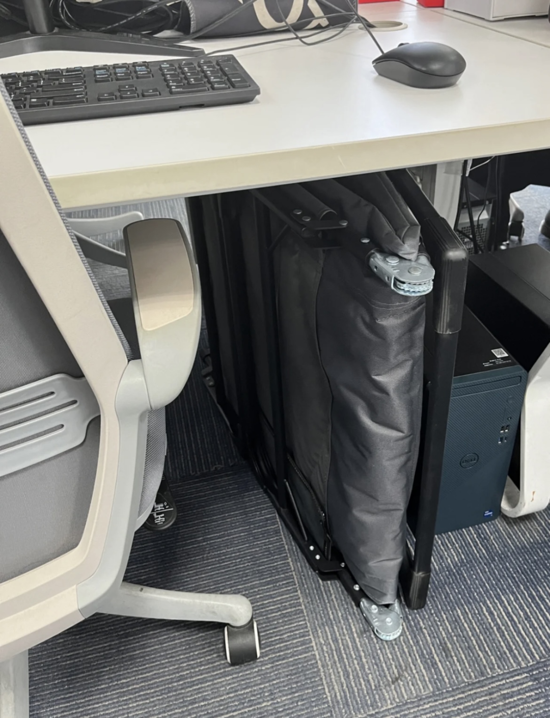 前者用力一抽,搬出藏在桌子底下的行军床,放倒后再一拉脚踏,即可当场表演何为“躺平大师”。