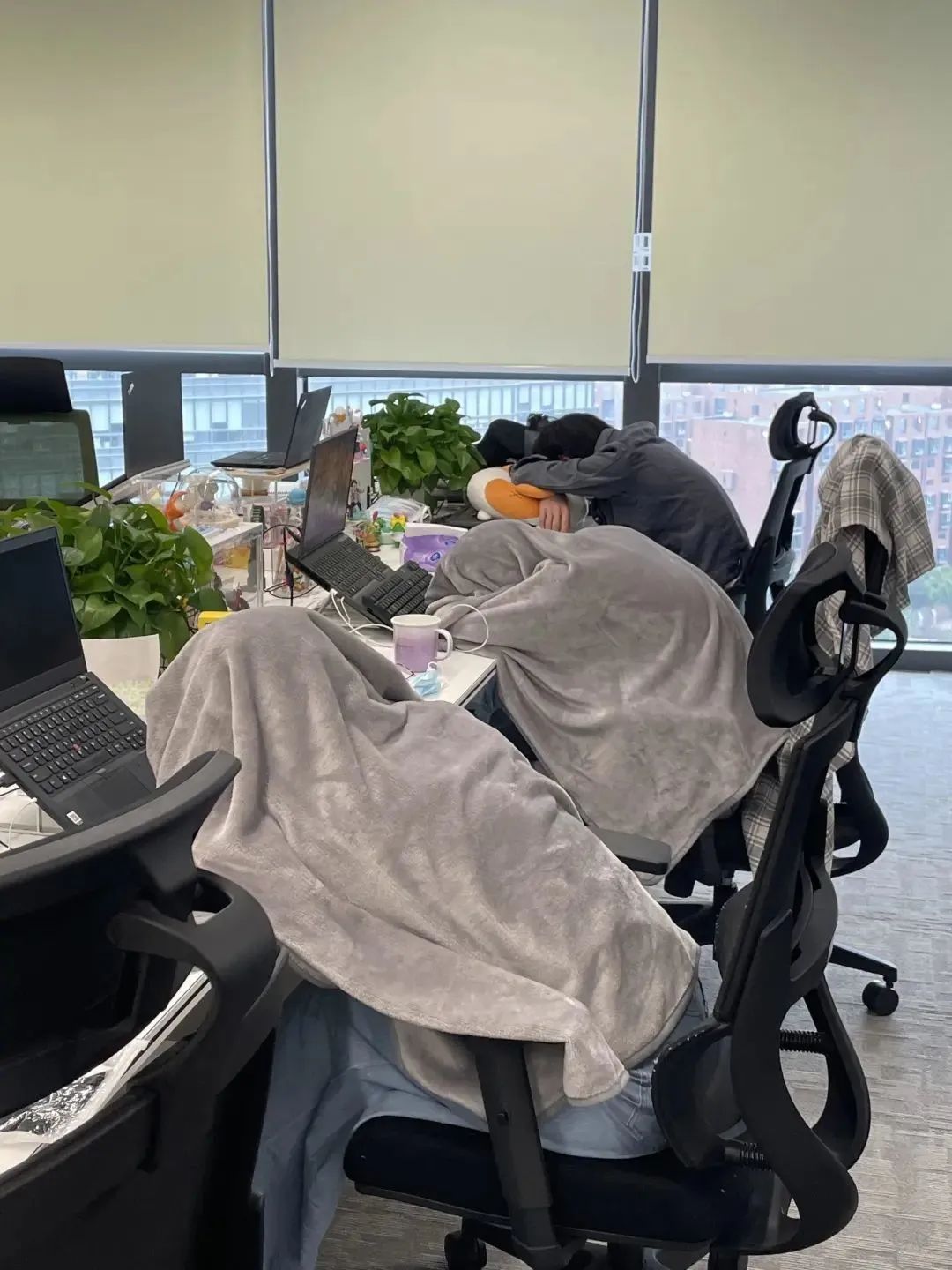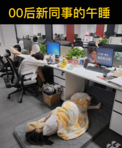 但所幸还有一些很勇的00后新同事,可以无畏周遭灼灼的目光,以横七竖八之势,在办公室呼呼大睡。