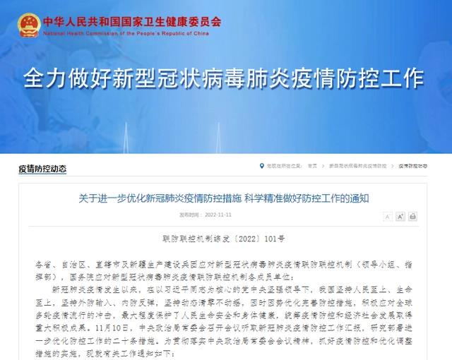 党中央对进一步优化防控工作的二十条措施作出重要部署、提出明确要求,国务院联防联控机制综合组11日公布《关于进一步优化新冠肺炎疫情防控措施 科学精准做好防控工作的通知》。这是坚定不移贯彻“动态清零”总方针下,对疫情防控工作的重大优化调整,影响范围广、力度大。