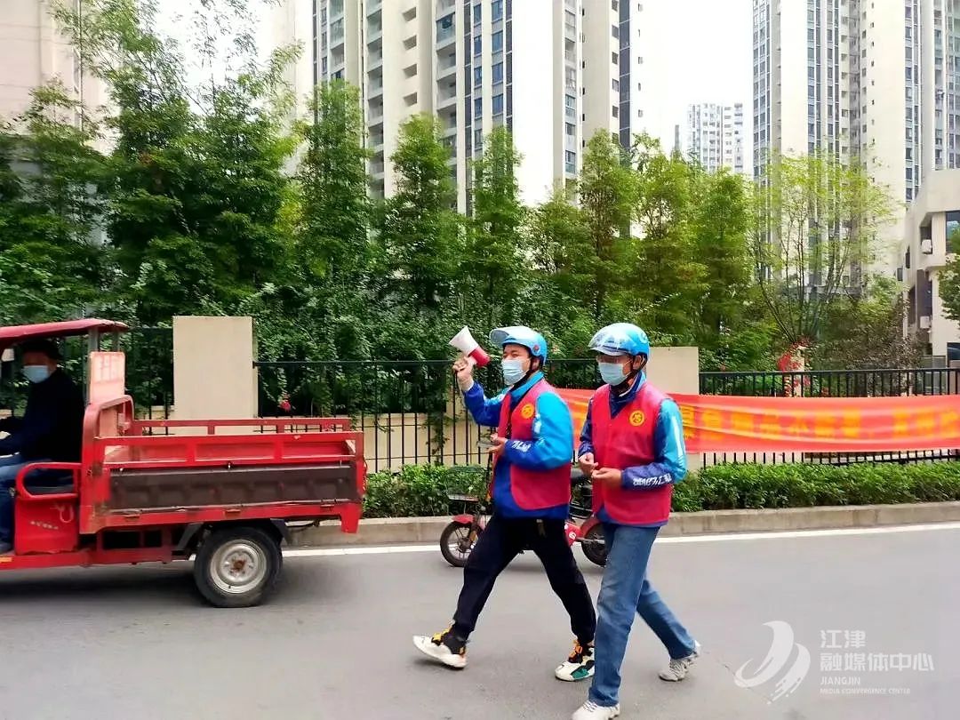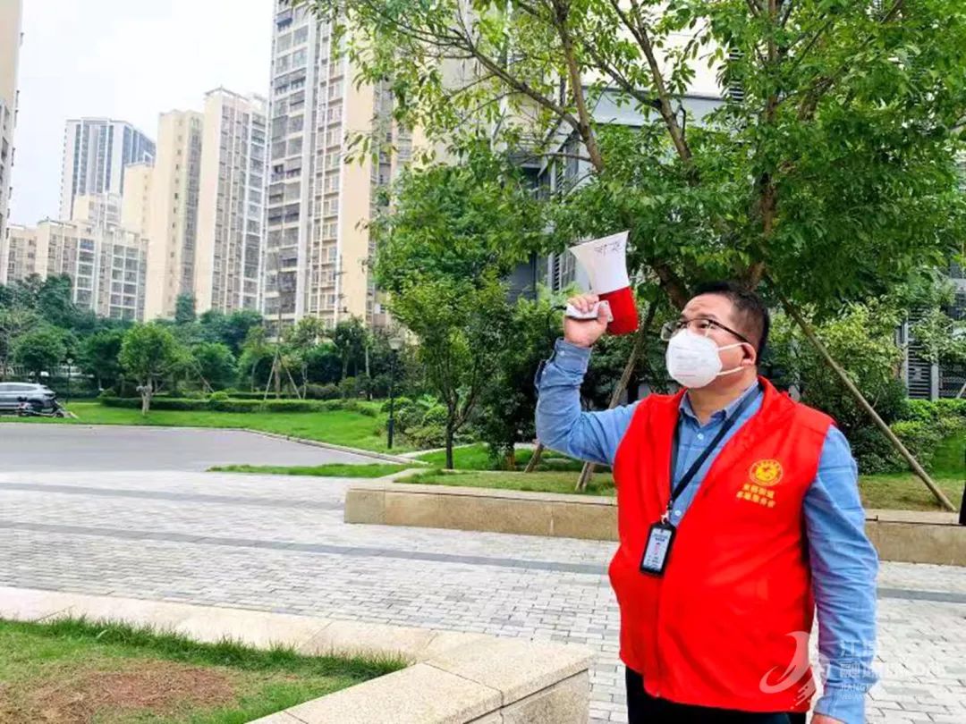 双福街道双凤路社区志愿者拿小喇叭宣传疫情防控政策,提醒居民做好自我防护