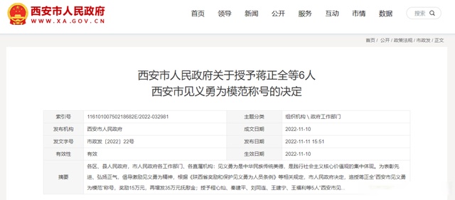 为表彰先进、弘扬正气,倡导激励见义勇为精神,根据《陕西省奖励和保护见义勇为人员条例》等相关规定,西安市人民政府决定,追授蒋正全“西安市见义勇为模范”称号,奖励15万元,再增发35万元抚慰金;授予程心灿、秦建平、刘同连、王建宁、王福利等5人“西安市见义勇为模范”称号,每人奖励15万元。