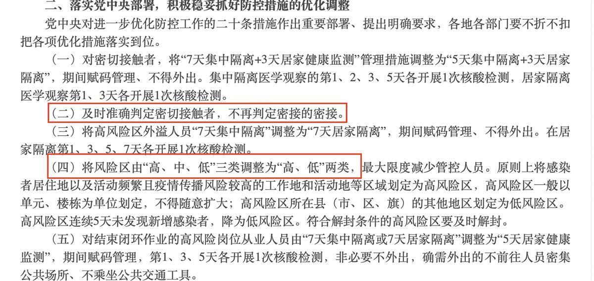 上述通知对进一步优化防控工作的二十条措施作出重要部署、提出明确要求。其中提到,及时准确判定密切接触者,不再判定密接的密接。通知还要求,将风险区由“高、中、低”三类调整为“高、低”两类,最大限度减少管控人员。原则上将感染者居住地以及活动频繁且疫情传播风险较高的工作地和活动地等区域划定为高风险区,高风险区一般以单元、楼栋为单位划定,不得随意扩大;高风险区所在县(市、区、旗)的其他地区划定为低风险区。高风险区连续5天未发现新增感染者,降为低风险区。符合解封条件的高风险区要及时解封。