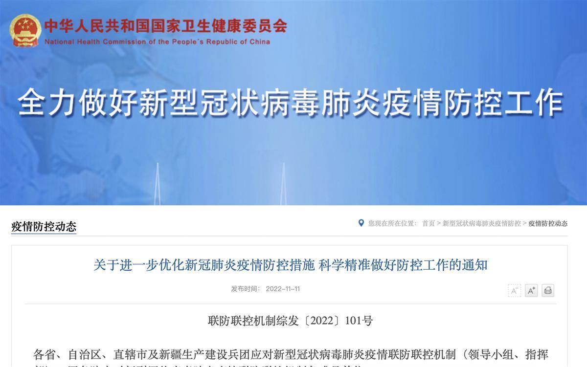 11月11日,据国家卫健委官网消息,国务院应对新型冠状病毒肺炎疫情联防联控机制综合组发布《关于进一步优化新冠肺炎疫情防控措施 科学精准做好防控工作的通知》。