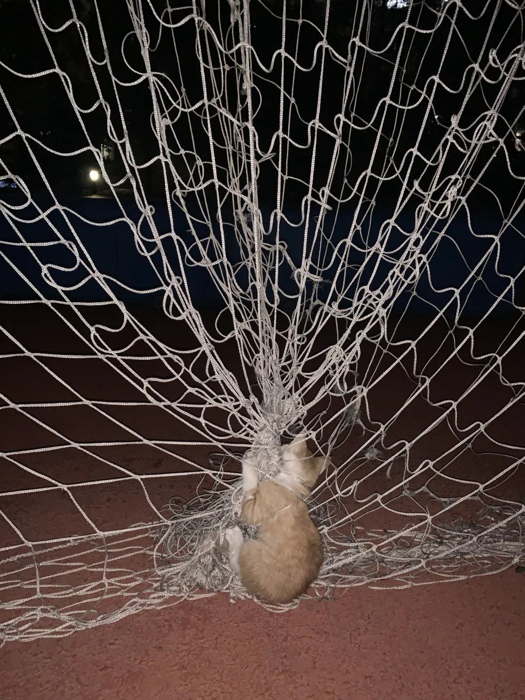 11月9日晚上10点10分,教学处副主任章冬萍在学校工作群求助:“学生说有一只猫被足球网缠住了,脖子和身体都被缠了很多圈。她们想救它,让保安叔叔一起去的,但猫的攻击性很强,保安的手刚刚被划破了一道,问能否把足球网剪破,把猫救出来。”