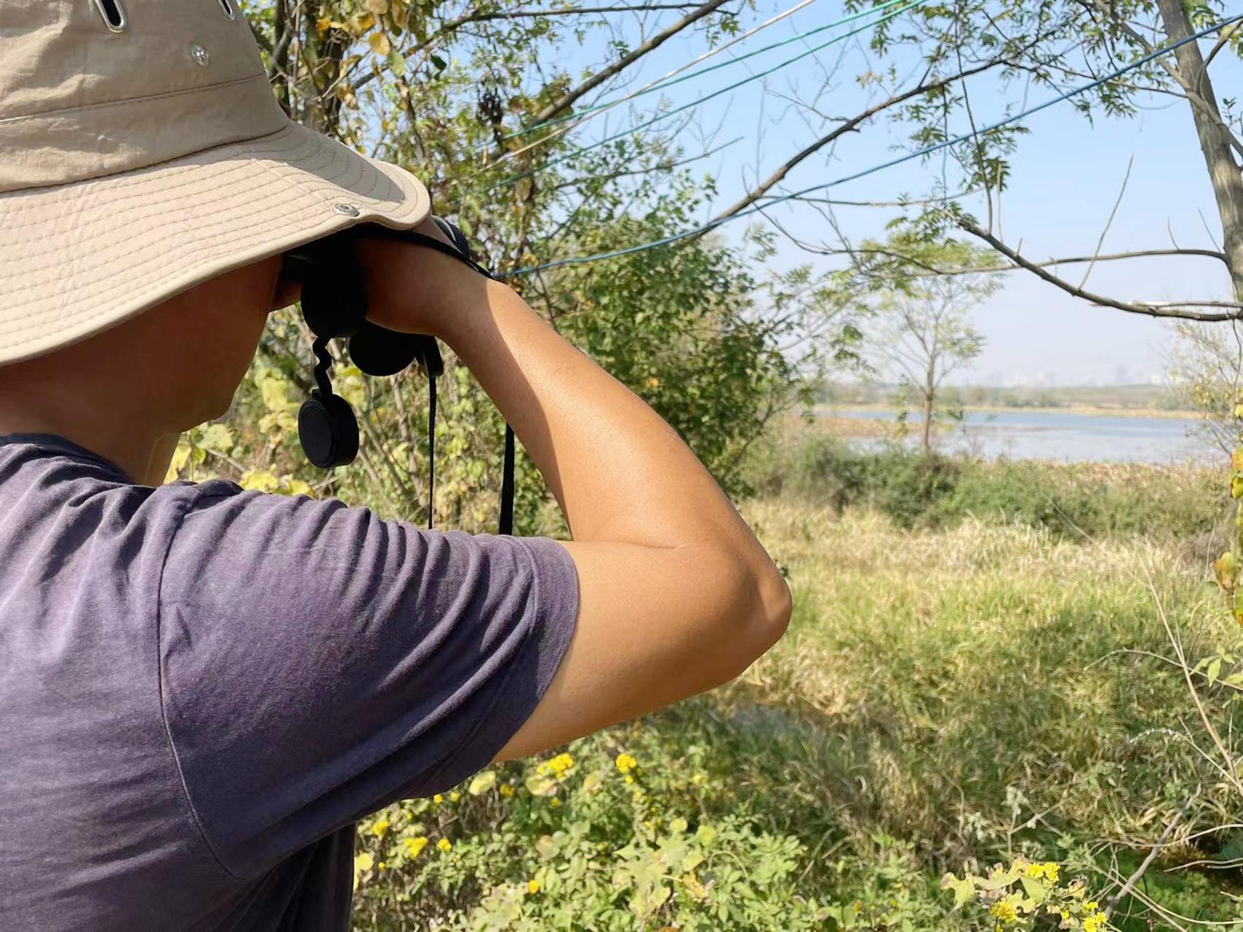 用望远镜观察虾塘动静