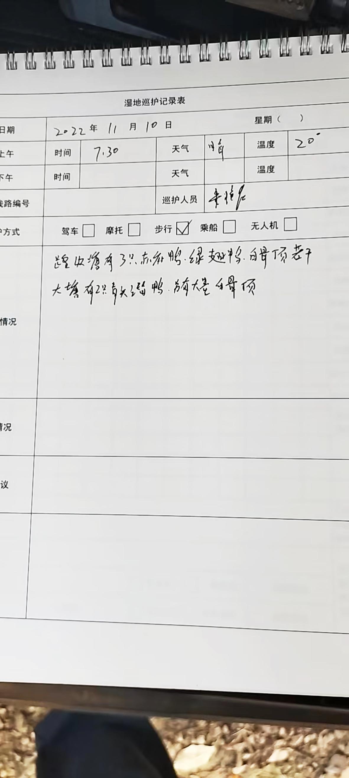 朱祥能每天仍坚持填写《湿地巡护记录表》,10日的记录写道:大塘有2只青头潜鸭,另有大量白骨顶……