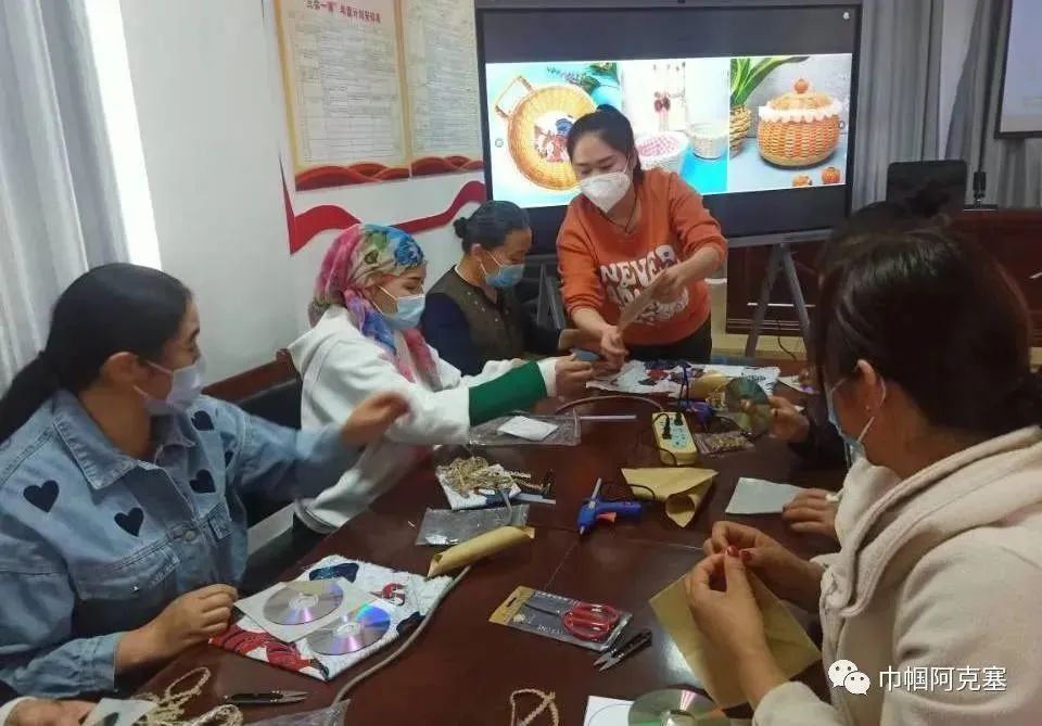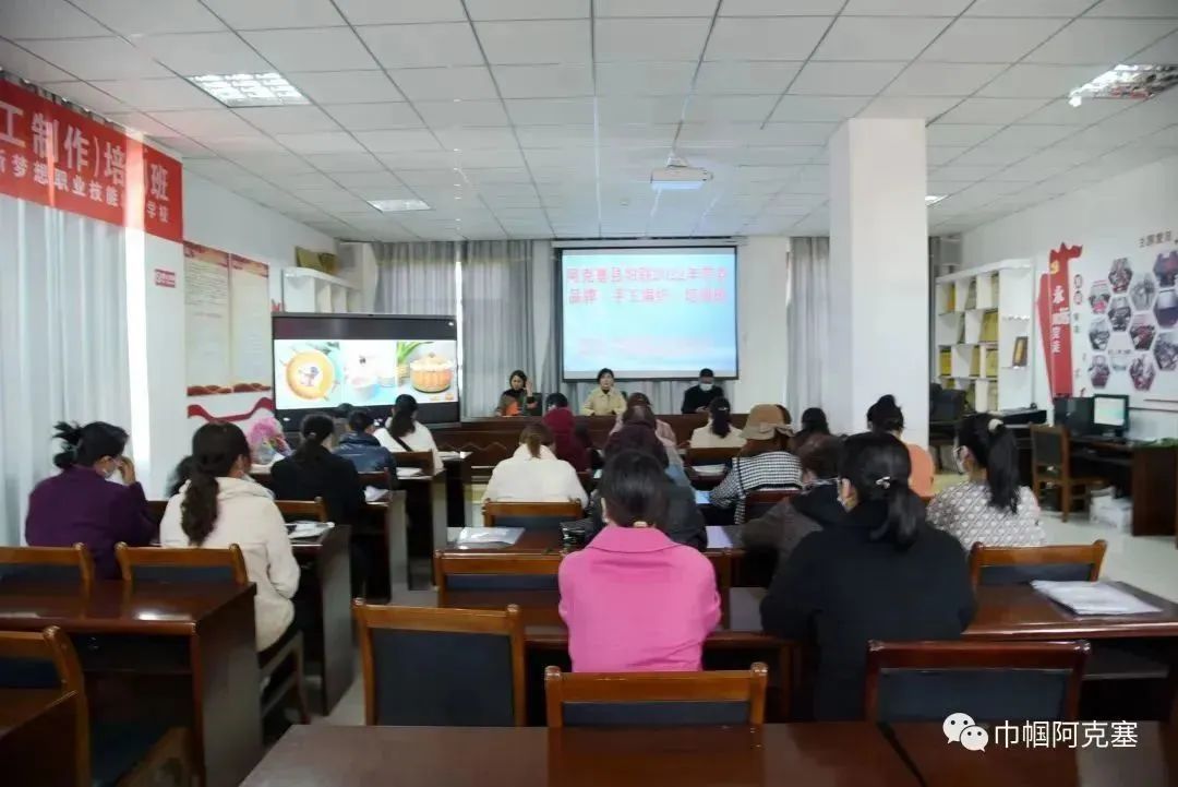 课堂上,培训教师用通俗易懂的语言,向各位参训姐妹介绍了培训课程的具体安排情况,讲解了手工编织的具体步骤并现场演示了编织流程和技艺,培训内容丰富多样,采用集中授课、手工示范、视频教学及实际操作等多种教学方式,本期培训班学时10天。