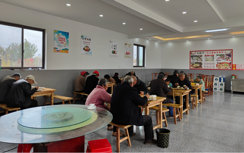 图为老人们在灵璧县老年助餐点里吃的津津有味