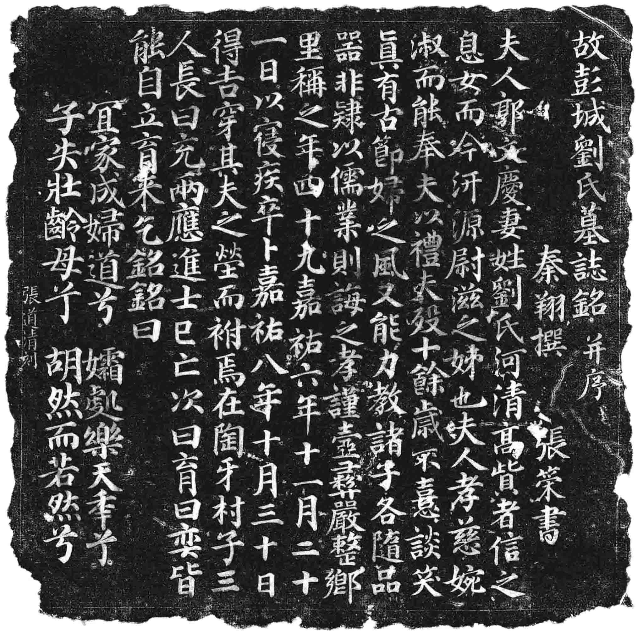 北宋《郭文庆妻刘氏墓志》,志石高42厘米,宽42.2厘米,厚11厘米。志文共15行,满行16字,正书。嘉祐八年(1063)十月三十日,志盖失,秦翔撰,张荣书。志石旧存国子监,现藏中国国家博物馆。