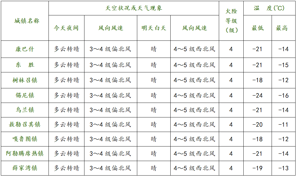 预计今天夜间到明天白天,鄂尔多斯市多云转晴,3~4级偏北风转4~5级西北风,气温下降12℃左右,最低气温-24~-18℃,最高气温-16~-11℃,天寒地冻。