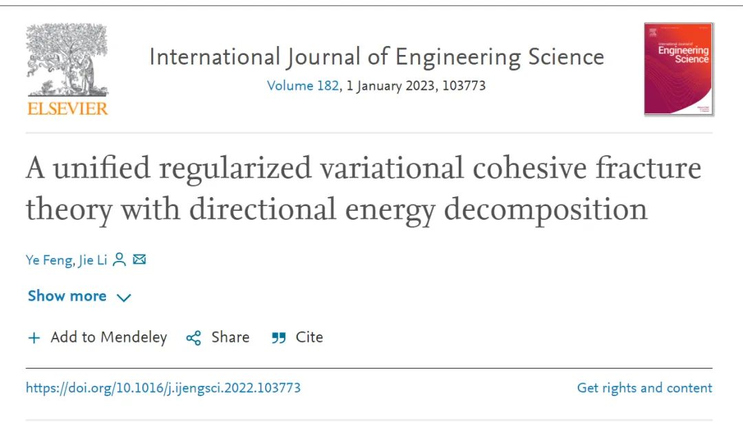 近日,中国科学院院士、同济大学土木工程学院李杰教授学术团队在工程科学旗舰期刊《国际工程科学杂志》(International Journal of Engineering Science)上发表论文,报道了团队在断裂相场理论研究前沿取得的新进展。这是该团队过去一年来在国际权威期刊上发表的第5篇系列研究论文。此前,团队已在固体力学国际旗舰期刊《固体力学与物理学杂志》(Journal of the Mechanics and Physics of Solids)上连续发表4篇论文。