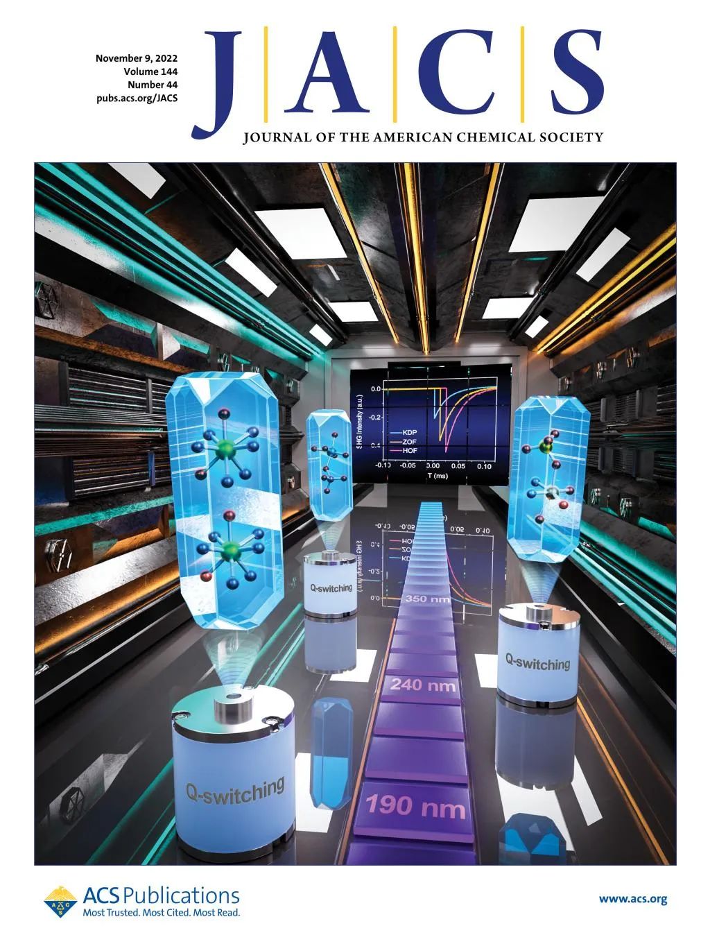 相关成果“Isoreticular Design of KTiOPO4-like Deep-Ultraviolet Transparent Materials Exhibiting Strong Second-Harmonic Generation”(等网络设计强二次谐波产生的KTiOPO4构型深紫外透过材料)11月10日以全文(Article)的形式发表于国际化学领域权威学术期刊《美国化学会志》(Journal of the American Chemical Society)上,并因研究工作的重要创新性和同行专家的高度认同而被编辑委员会遴选为期刊最新一期的封面文章。