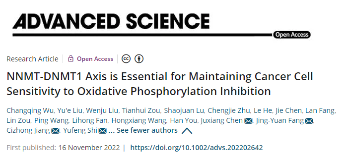 11月16日,《高级科学》(Advanced Science)上报道了同济大学癌症中心施裕丰团队、生命科学与技术学院江赐忠团队联合上海交大仁济医院房静远团队、上海长海医院陈菊祥团队开展合作研究,首次发现NNMT-DNMT1信号轴影响肿瘤细胞对线粒体氧化磷酸化抑制剂的敏感性。该研究揭示了肿瘤细胞对线粒体氧化磷酸化抑制剂敏感性和耐药的分类标签,为靶向线粒体氧化磷酸化治疗肿瘤提供了新策略。
