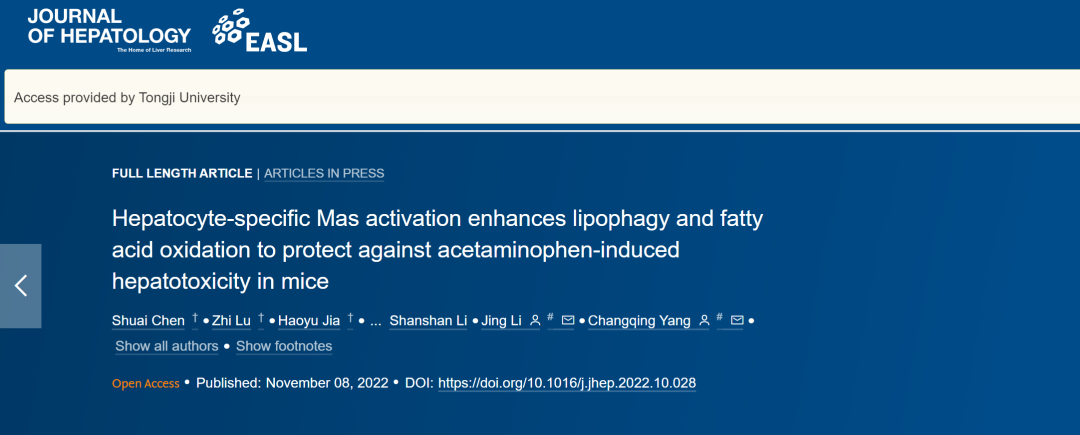 11月8日,同济大学附属同济医院消化内科杨长青教授团队在国际期刊《肝病学杂志》(Journal of Hepatology)以Original Article形式在线发表了题为“Hepatocyte-specific Mas activation enhances lipophagy and fatty acid oxidation to protect against acetaminophen-induced hepatotoxicity in mice”的论文,揭示了Mas信号在DILI进程中的关键地位及核心机制,为药物干预新靶点的开发提供了重要的数据支持。