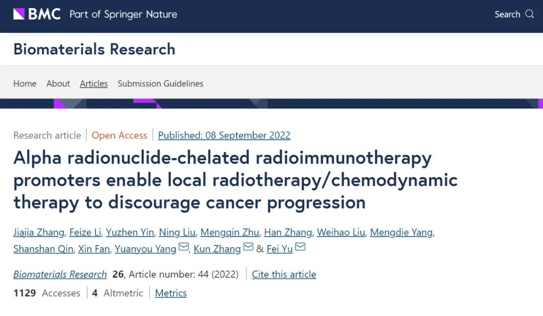 阿尔法射线能量强、射程短、耐乏氧、易防护,以其不同于其他核辐射的独特优势,在肿瘤治疗中的潜力日益受到科学家和医生们的重视。近日,同济大学核医学研究所余飞教授团队在生物材料领域的国际权威期刊《生物材料研究》(Biomaterials Research)上发表了“基于阿尔法射线的免疫协同疗法”在治疗肿瘤中的相关研究论文。