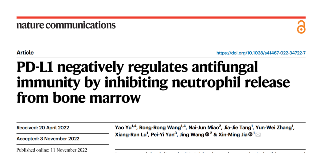 PD-L1是一种跨膜蛋白,主要与其受体PD-1结合传递免疫抑制信号,在肿瘤免疫逃逸、细菌和寄生虫感染免疫、自身免疫性等疾病中发挥重要作用。11月11日,同济大学医学院、同济大学附属第十人民医院贾鑫明教授团队在《自然·通讯》(Nature Communications)上在线发表了题为“PD-L1 negatively regulates antifungal immunity by inhibiting neutrophil release from bone marrow”的论文。该研究揭示了PD-L1负调控抗真菌免疫的新机制。
