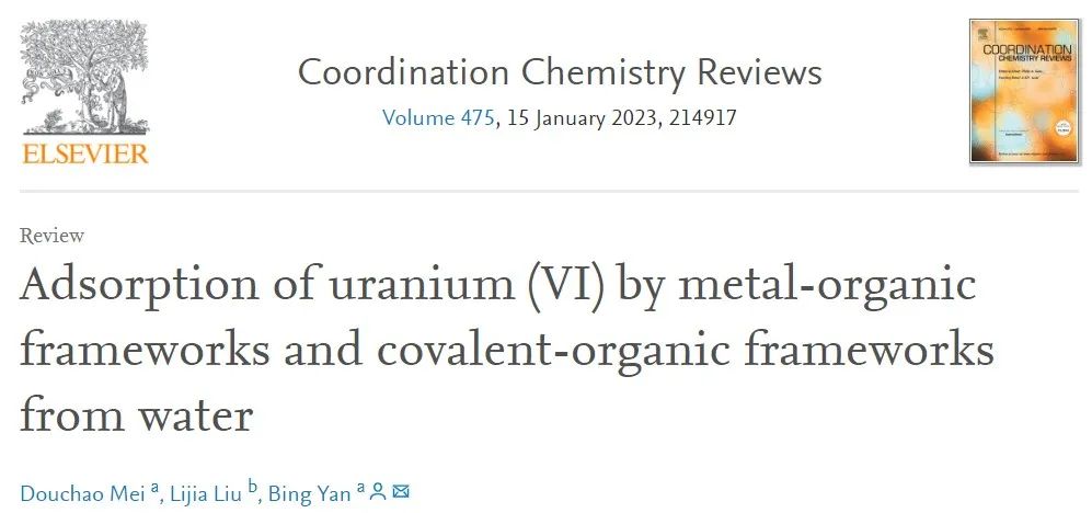 同济大学化学科学与工程学院闫冰教授长期致力于金属有机框架材料(MOFs)和共价有机框架材料(COFs)的合成与应用研究。近日,闫冰教授课题组在国际著名期刊《配位化学综述》(Coordination Chemistry Reviews)上发表了题为“Adsorption of uranium (VI) by metal-organic frameworks and covalent-organic frameworks from water”的论文,系统总结了MOFs和COFs在海水提铀和废水除铀方面的应用。