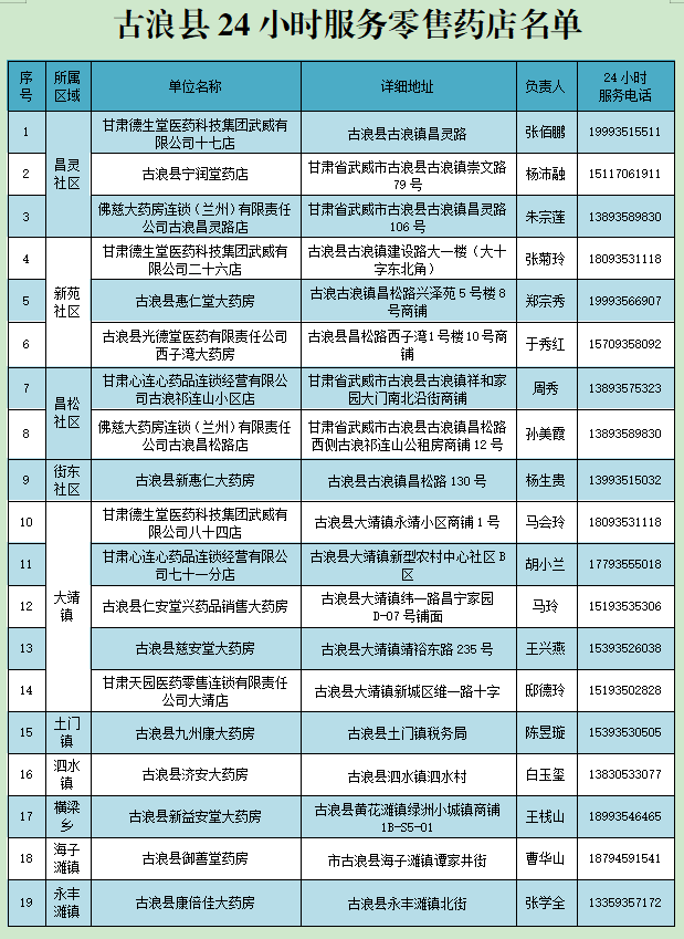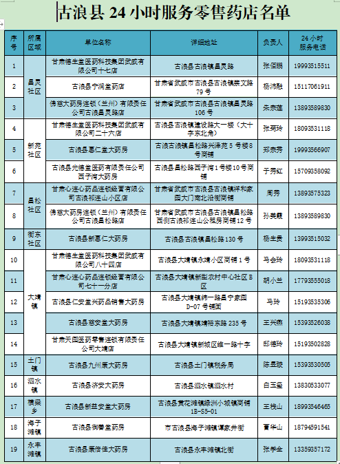 古浪县关于公布351家24小时服务医疗机构零售药店名单的公告