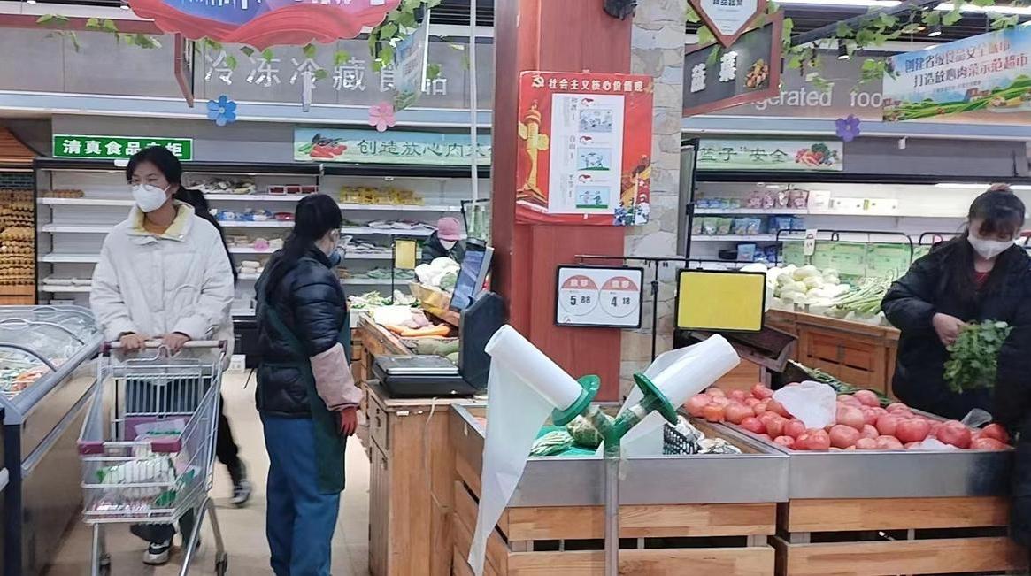 在县城华联玛特超市,记者看到超市入口处摆放有酒精、免洗洗手液等防疫消毒物资。居民有序进入超市购物,超市内米面油、肉蛋、蔬菜水果、熟食、日用品等各类商品摆放整齐、种类齐全、货源充足。居民佩戴口罩,有序购物消费,秩序井然,到处都是热气腾腾的生活气息。