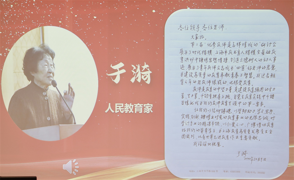 “希望老师们以信仰铸魂,以坚韧助力,学习、思考、实践、创新,锤炼出对党的教育事业的无限忠诚,对学识专业的精湛本领,以仁爱之心、广博情怀教育好我们的莘莘学子,为上海教育高质量发展走在全国前列,比肩世界先进教育作出贡献。”第二届“优秀教师是怎样炼成的”研讨会暨《学做于漪式好老师》新书发布会在上海教育出版社举行,沪上教育界约300人通过线上线下方式参与研讨,93岁于漪的线上寄语,恳切真诚,发人深思。