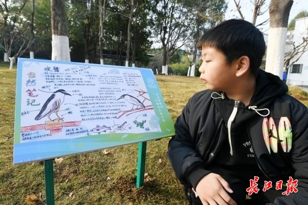 “这块夜鹭的科普牌是我设计的,我先查了资料,然后画出它站立在树枝的样子。”长春街小学五年级的杨宇泽手绘了夜鹭的自然笔记,展示了它捕食时候转动眼球和挥舞翅膀的样子。“看到我的作品在月湖公园展示出来,我觉得开心又骄傲。”
