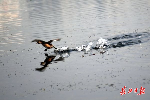 水面滑行迅猛的小䴙䴘。记者李子云 摄