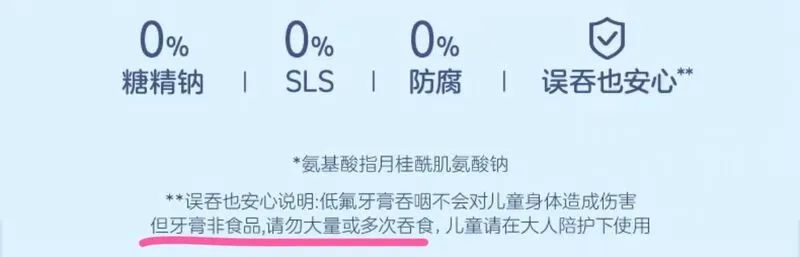 从产品介绍看,这些儿童牙膏只是增加了天然原料的使用,减少了人工色素、防腐剂等成分,但并非食品。有的品牌一边在产品首页宣称“可吞咽宝宝牙膏”,另一边却在详情页用小字标注“牙膏并非食品,请勿大量或多次吞食”。