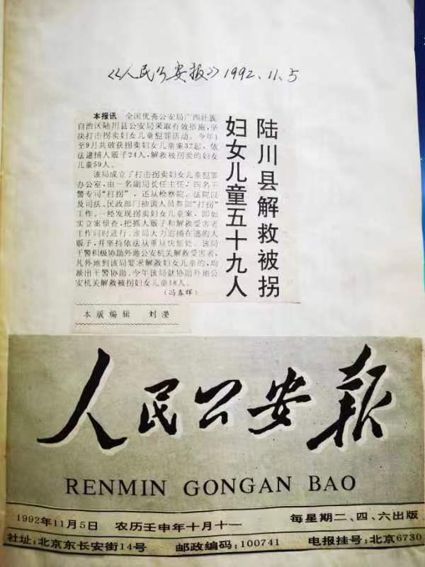 回到培训班后,我想到当时全国正在开展打击拐卖妇女儿童专项行动,立即打电话回单位收集相关工作措施、效果,写出一篇消息稿送到人民公安报社。由于得到报社编辑的指导,稿件内容又符合当时公安工作重点,且我局打拐工作成绩突出,1992年11月5日,稿件被《人民公安报》以《陆川县解救被拐妇女儿童59人》为题刊发,全文303字。