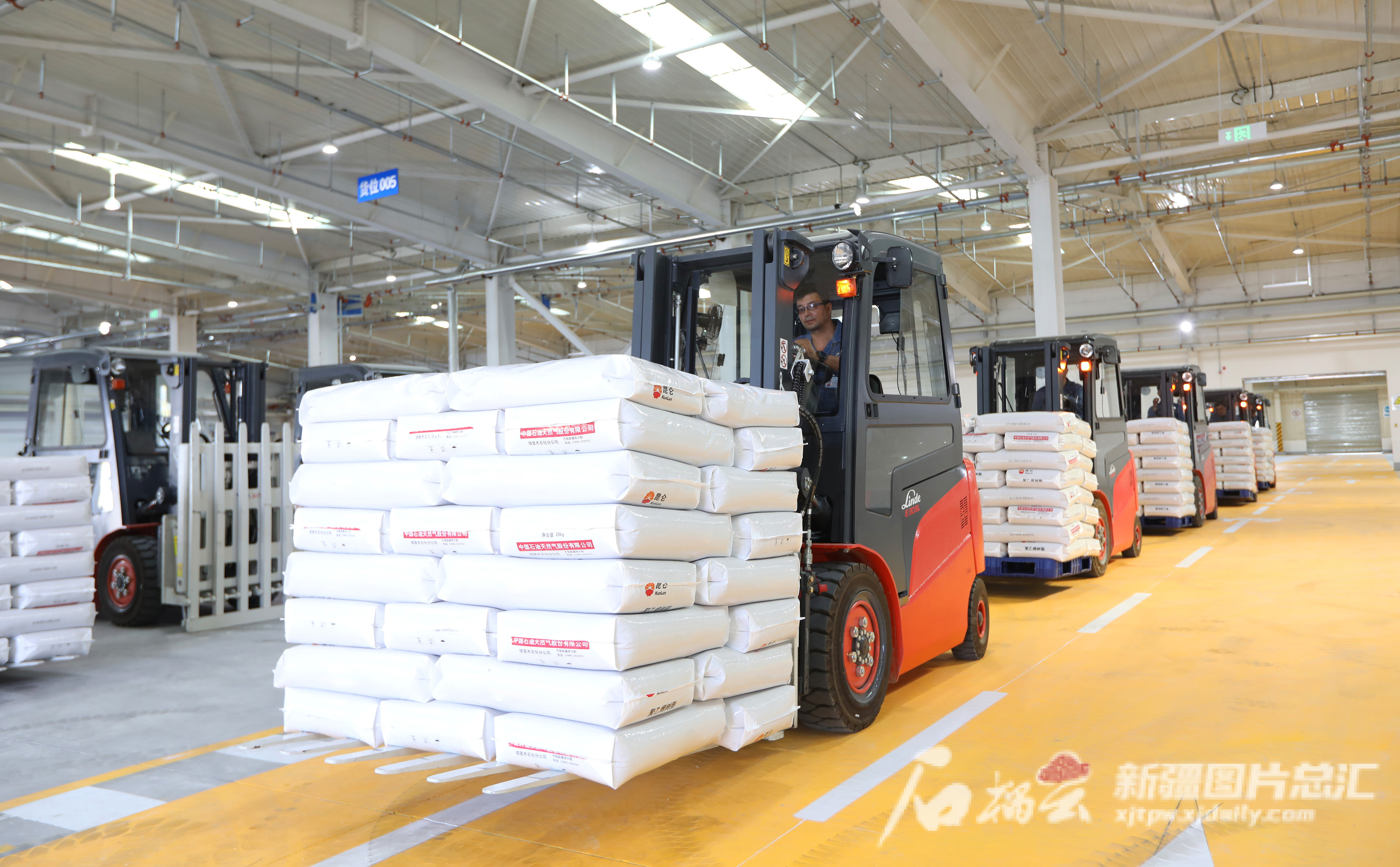 12月11日,独山子石化塔里木石化分公司成品车间,工作人员正驾驶叉车转运聚乙烯产品。马宇摄