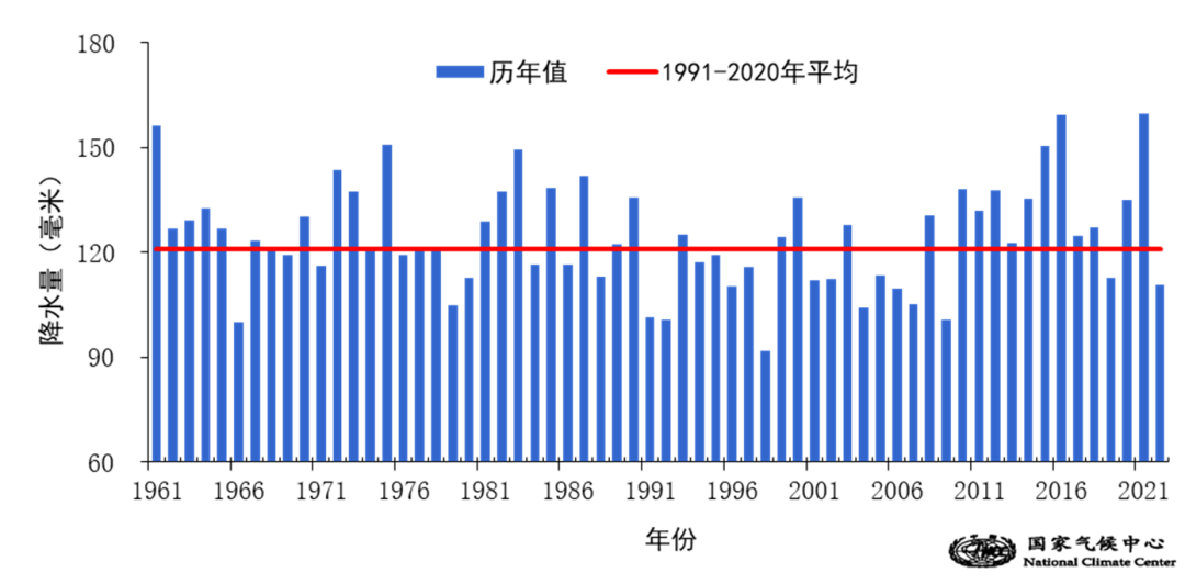 图3 1961年至2022年秋季全国平均降水量历年变化(单位:毫米)